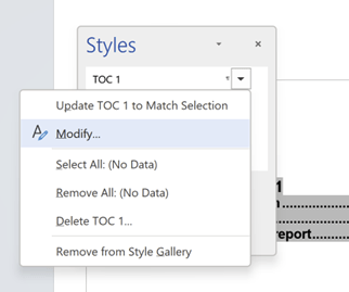 Scroll to the TOC1 style. in the Styles Gallery dialog, to the right of the style there will be a drop-down arrow. If you select this, the gallery sub-menu will display.